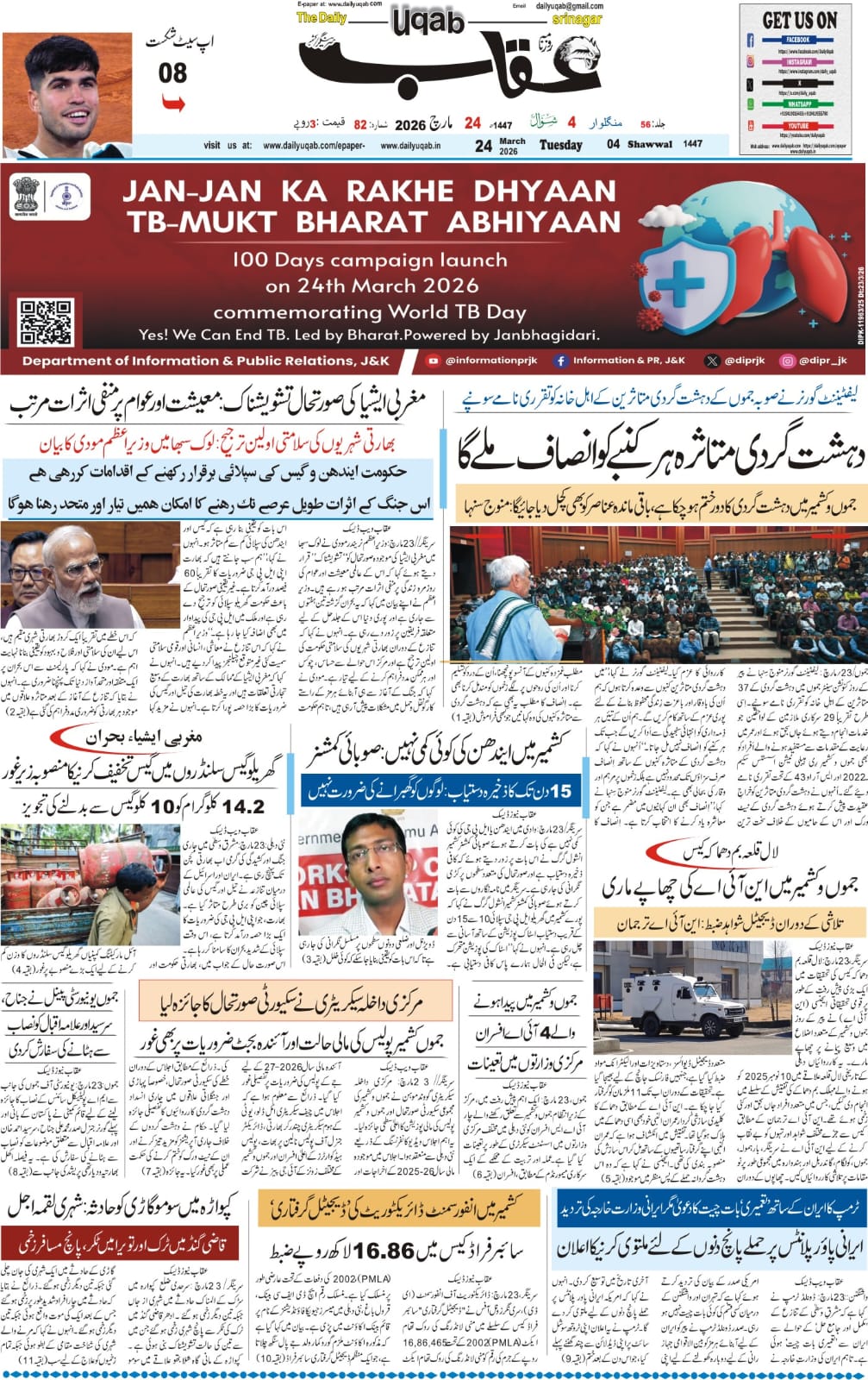 ایران امریکہ جنگ بندی پر جموں کشمیر لیڈران کا رد عمل؛ ‘مذاکرات ہی واحد حل’ جموں و کشمیر میں دہشت گردوں کے سہولت کاروں پر گھیرا تنگ، مزید دو سرکاری ملازمین ملازمت سے برطرف شالگڑی، بنی ہال لینڈ سلائیڈ کے بعد این ایچ-44 بند، ہزاروں مسافر پھنس گئے امریکہ اور ایران دو ہفتے کی جنگ بندی پر رضامند ایران میں موجود بھارتی شہریوں کے لیے اہم ایڈوائزری، جنگی صورتحال کے پیش نظر احتیاط کی ہدایت